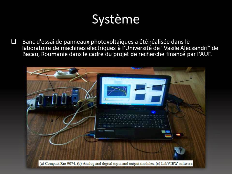 This work presents an experimental stand for the study of a power electronics control system to locate and track the maximum power point of a photovoltaic (PV) array to ensure efficient power transfer from the solar cells to the load under varying environmental conditions. A real-time photovoltaic solar cell measurements and a control system was developed to guarantee that the maximum power output is attained. This stand is built at the Electrical Machinery Laboratory of “Vasile Alecsandri” University of Bacau, Romania.